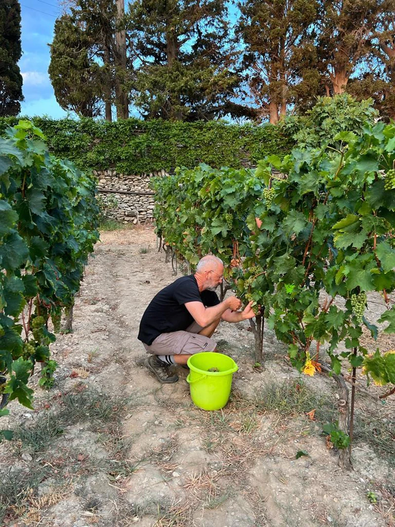 Every year around mid-August, the Muskat grapes—quietly ripening all summer under the sun and near the sea—finally reach their moment. Their perfume fills the air: floral, sweet, a little wild. When the sugar levels, measured carefully in the grapes, hit just the right point, we know—it’s time.